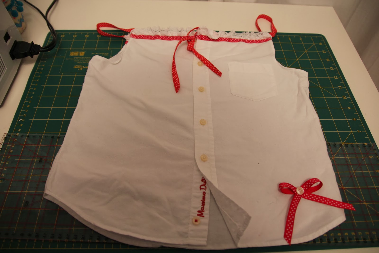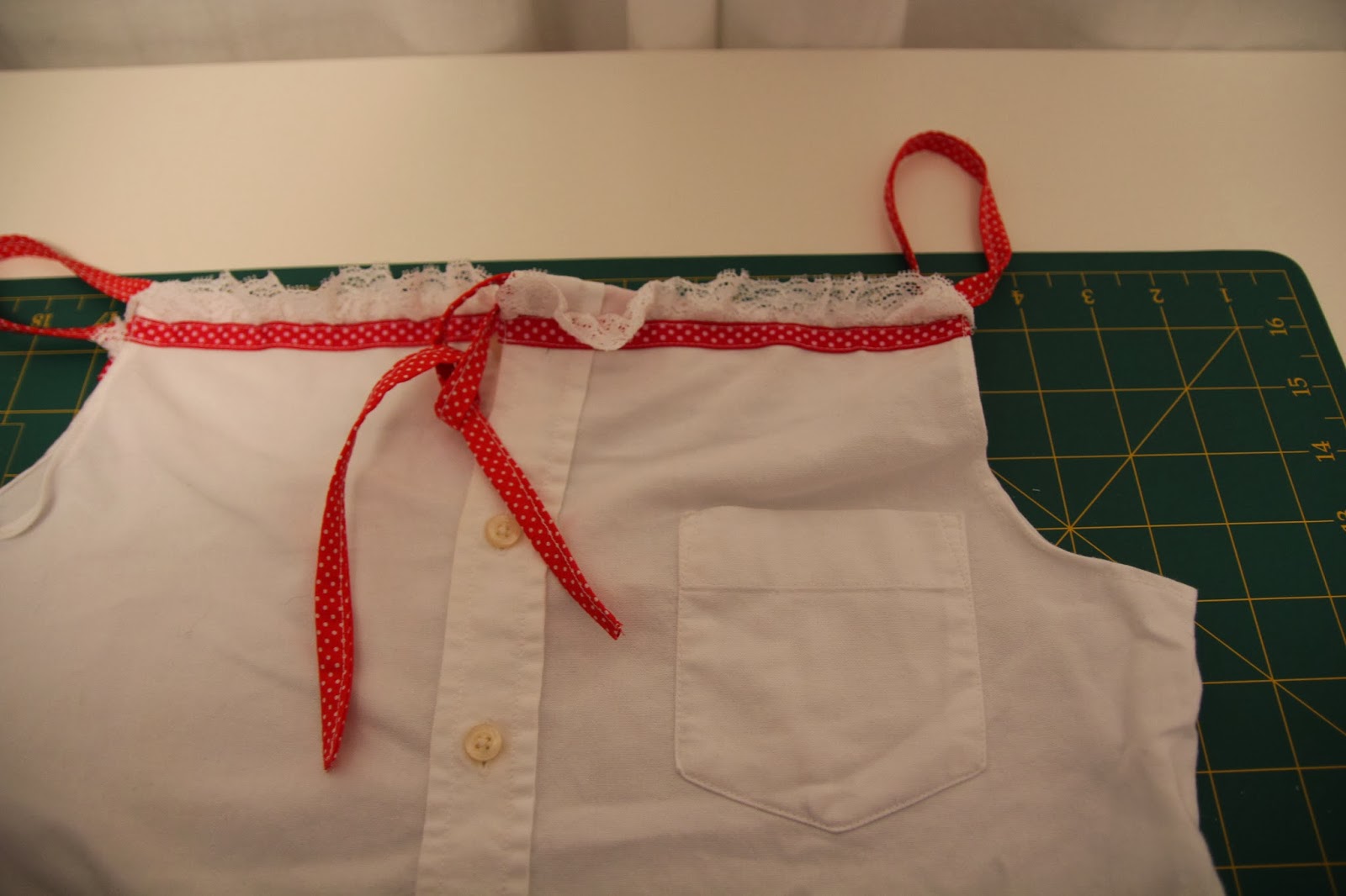 Retirei as mangas e cortei a direito antes do colarinho. Acrescentei renda, cosida com uma fita as bolinhas e umas alças também as bolinhas. Depois foi só colocar um lacinho mais abaixo.